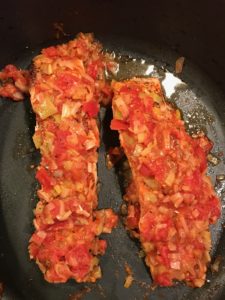 This is a sauce you have to make because it is sooo versatile! In the picture I’ve smothered salmon fillets with it. What I had leftover, I heated up the next morning and used with fried eggs, toast and avocado. Yummy! It would be great with potatoes, chicken, etc. Awesome sauce!