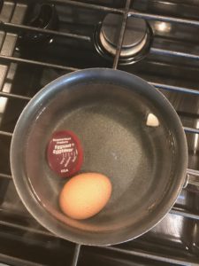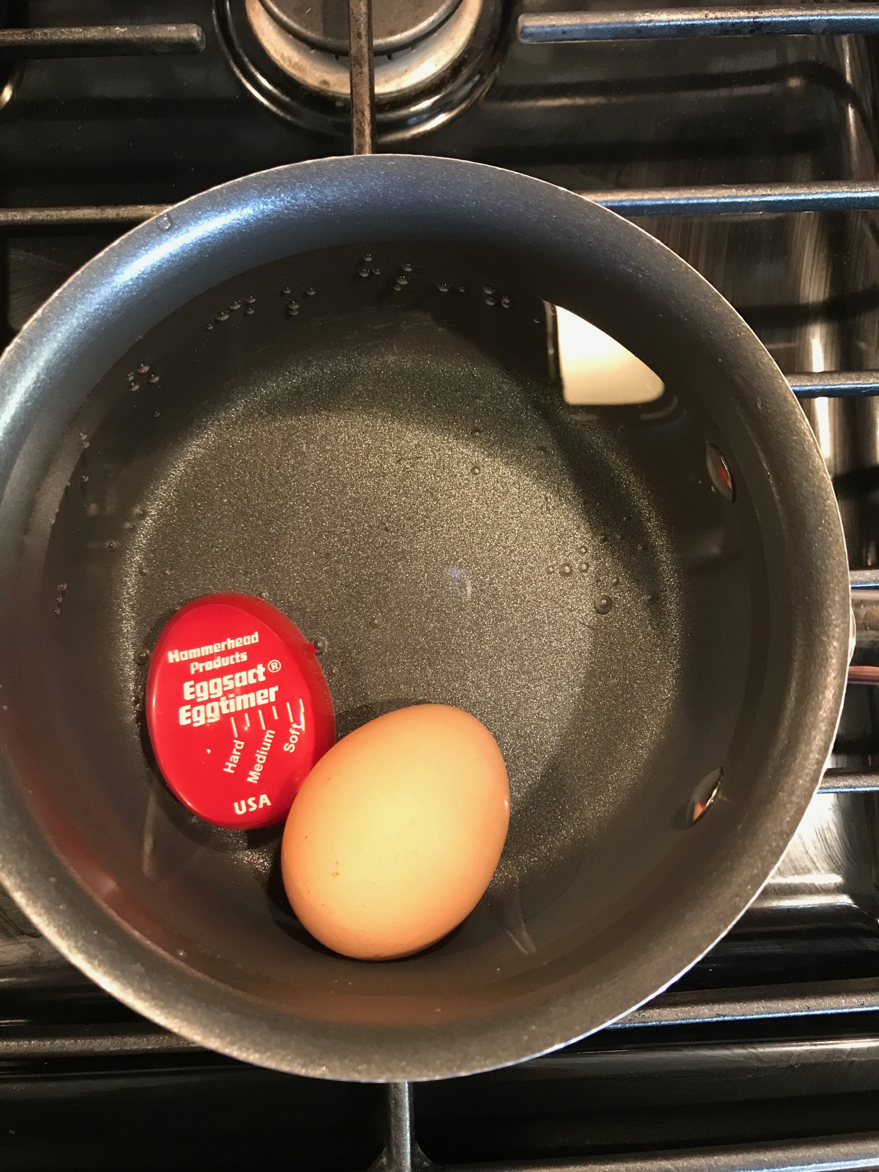 Place the eggs in a saucepan and add water so that it covers the eggs by an inch. Use the egg timer in the pan as well. With this timer, I don’t have to know how long to cook a hard boiled egg. I love that! I just wait until all the bright red turns a dark and it’s done.