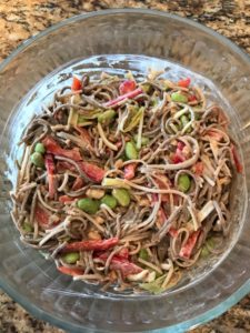 Here is a fun vegetarian noodle salad that has great textures and flavors.  You can eat on it for several days so I always make a lot.  It’s got plenty of protein too so it’s very filling.  Winner!