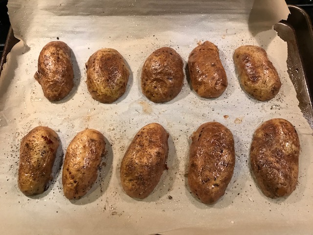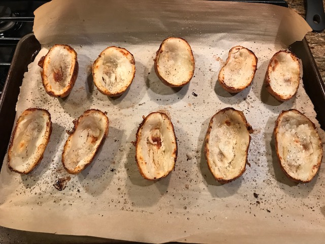 With the cut side down, drizzle the potato skins with olive oil, salt, and pepper and place on the baking sheet. Roast for 10 minutes.